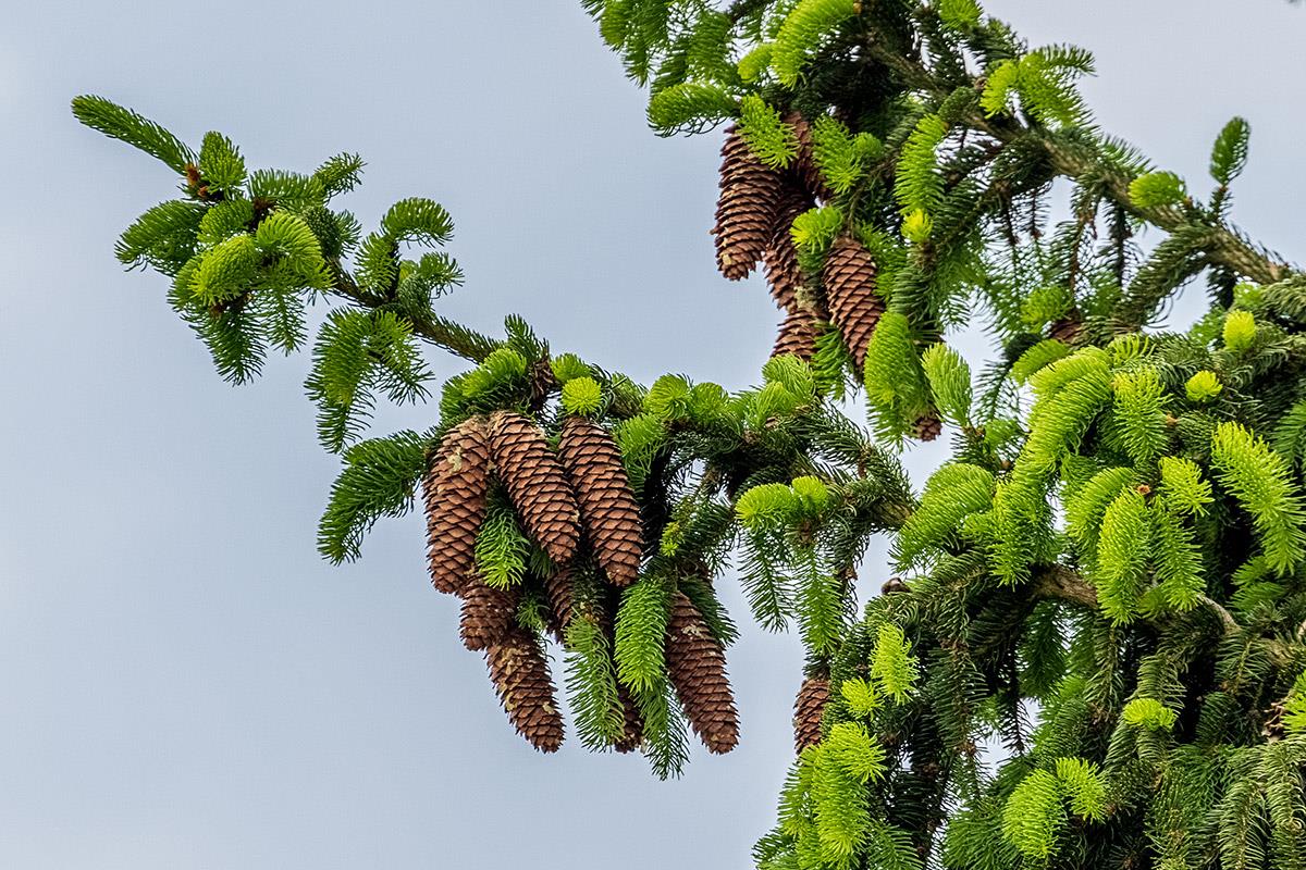 Smrk začíná plodit od 60 let a semenné roky se opakují po 4 až 5 letech. Šišky jsou různé velikosti od 8 do 20 cm a 3-4,5 cm široké. Na podzim prvního roku se otevřou a po vypadnutí semene odpadávají celé.