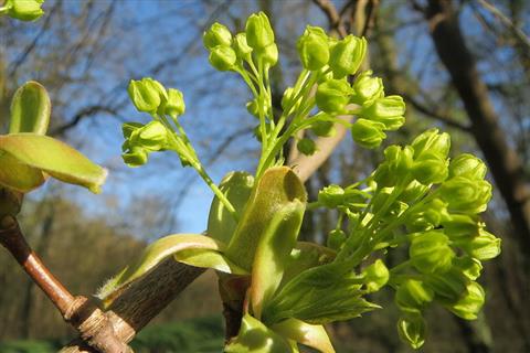 Dospělosti dosahuje jako solitérní, samostatně rostoucí strom, který začíná plodit ve věku 20–30 let, v zápoji lesního porostu v 30–40 letech. Kvete krátce před rašením listů na přelomu dubna a května. Plodem jsou zploštělé dvounažky, 4–6 cm dlouhá křidélka, které svírají tupý (vodorovný) úhel. Dozrávají v září.