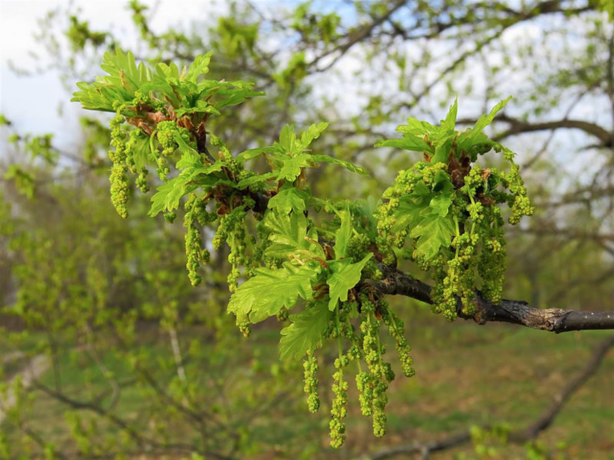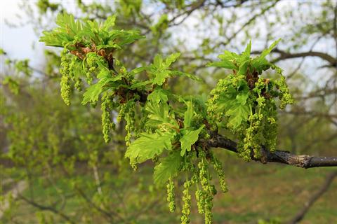 Solitérní strom začíná plodit ve 30-40 letech, v porostu v 50-70 letech, semenné roky se opakují po 3-5 letech. Kvete v květnu současně s rozvíjením listů. Dub je jednodomá rostlina – květy rostou odděleně na téže rostlině. Plodem jsou soudečkovité nažky – žaludy, které dozrávají v září až říjnu.