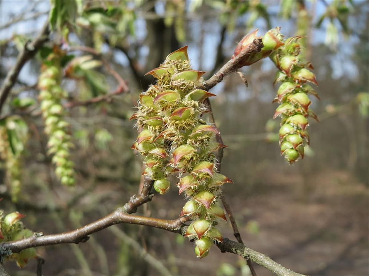 Kvete v dubnu až květnu současně s rozvíjením listů. Samčí visící jehnědy měří do 5 cm, samičí bývají kratší a štíhlejší. Plodit začíná okolo 20. – 30. roku, plodí skoro každoročně a poměrně bohatě, semenné roky se opakují v 2–3letých intervalech. Plodem je 1 cm velký oříšek. Plody dozrávají na podzim v říjnu a vytrvají na stromě přes celou zimu.